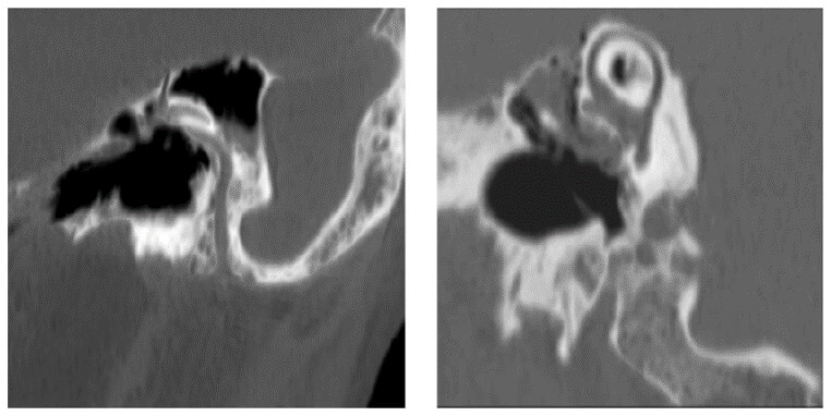 On these images, we can see an example of how the minimum intensity projection is used in the diagnosis of the semicircular canal. Abnormalities such as cholesteatomas can be easily seen.