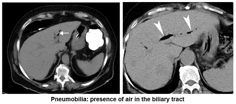 This example shows us the presence of air in the biliary tract known as pneumobilia. Notice the white arrows pointing out the air.