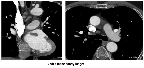 Both images show the presence of nodes in the Barety lodge, or Baréty’s box (or right pre-tracheal space). It is an anatomical space located in the middle mediastinum of the human thorax which is formed of a cellulo-lymphatic tissue running along the trachea.