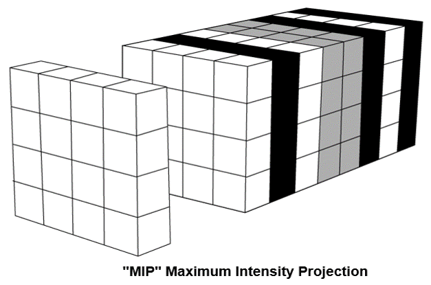 The maximum intensity projection consists of projecting the voxel with the highest attenuation value on every view throughout the volume onto a 2D image. An image that displays the maximum intensity for each pixel point on a thickened reformat plane.