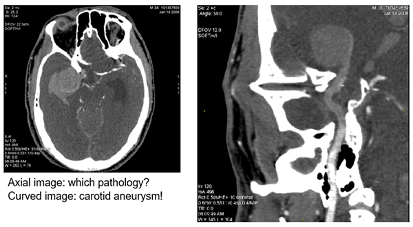 The image post-processed with a curved technique shows a carotid aneurysm in the upper third of the image on the right.