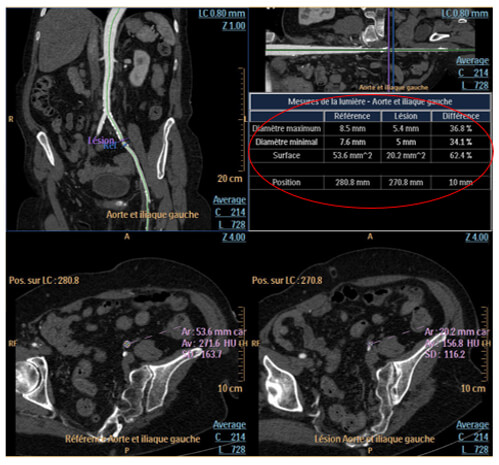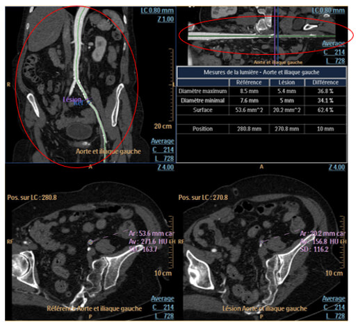 Stenosis percentages, maximum and minimum diameter and the surface are displayed in the following table.