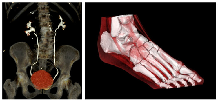 You can see on this image an example of maximum intensity projection which is used to search for ureter stenosis caused by perivesical lithiasis.