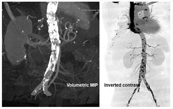 Here an example of shows where the maximum intensity projection is used to search for vascular diseases or anomalies.