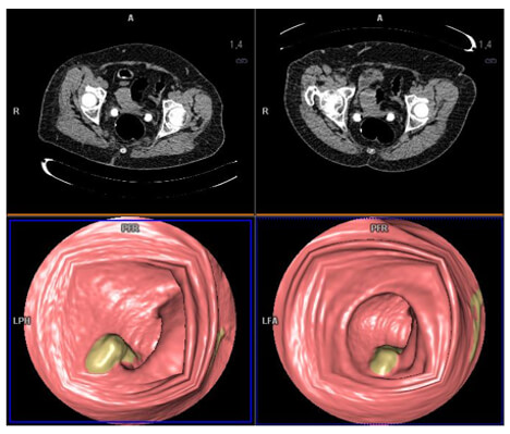 The lowest Hounsfield units voxels (near air) have a maximum transparency effect. The voxels with great HU present a significant opacity which materializes the wall of the colon. This is a 3D visualization of the interior of a hollow organ.