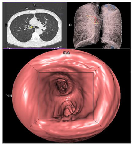 Bronchial endoscopy allows the visualization of the bronchial lumen filled with an inhalant object or invasive cancer. This is a 3D visualization of the interior of a hollow organ.