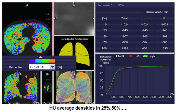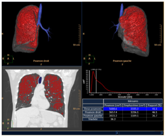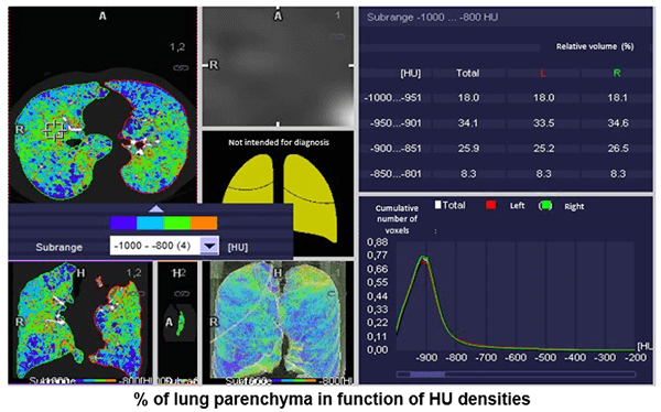 The automated application called “lung density” provides the physician with quantitative data on the volume of pulmonary emphysema, as well as gives us a visual representation of its diffusion.