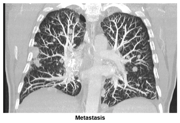 The image shows where the maximum intensity projection is used to search for parenchyma solid nodule lesions. Notice the many metastatic lesions shown in both lung fields.