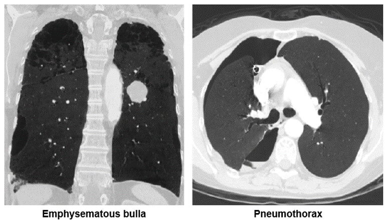 Both of these images show how the minimum intensity projection technique is used for the diagnosis of emphysema. Notice the bullae in the image on the left and the pneumothorax in the left lung on the image on the right.