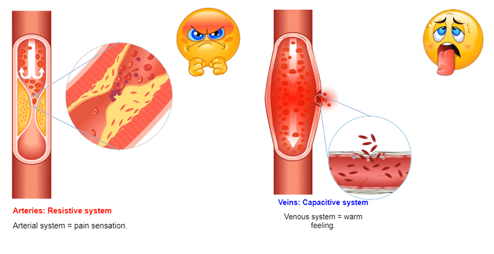 The venous system is a capacitive system and it dilates easily causing a heat sensation. The arterial system is a resistive system, the vessel does not dilate easily, which causes a painful feeling.