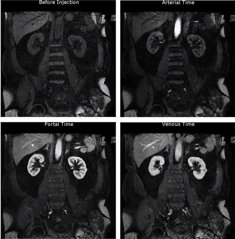 This image is a multiphase abdominal scan. An abdominal acquisition before injection, during the arterial phase, portal phase, and venous phase. We can also observe the vascular lesion of the left kidney.