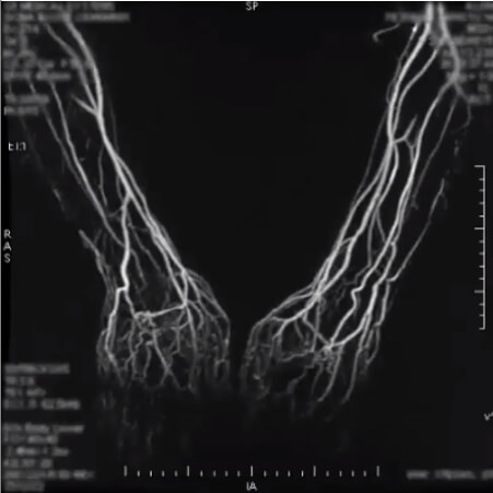 This second image is a 4D sequence of an upper extremity MRA. A 4D-sequence, which is a 3D-sequence with a fast time resolution. The volume is refreshed very quickly.