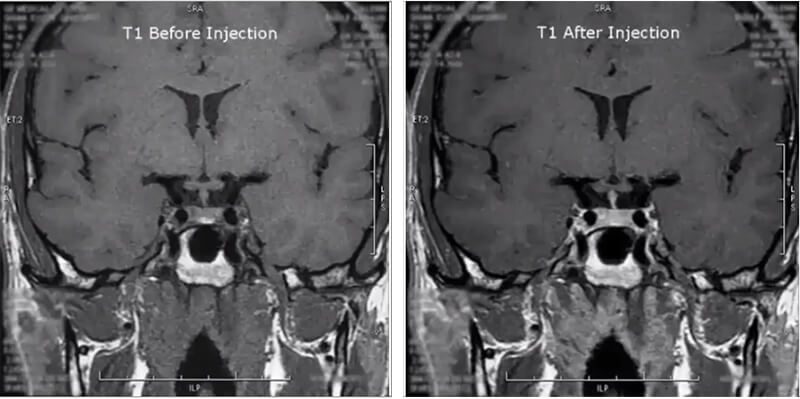Next is a pituitary study. This image is a coronal T1 of the pituitary gland before and after injection. Notice how the contrast makes the pituitary gland highlight.