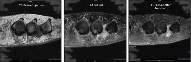 On the fourth image, we are evaluating Morton’s neuroma in T1 and we see that darkened area between two of the toes. Next, we run a T2 fat sat, which suppresses the fat and allows us to see true pathology. Then we run the post-contrast as a T1 injected fat sat. Again suppressing the fat, but notice the contrast enhancement of the lesion now compared to the first T1.