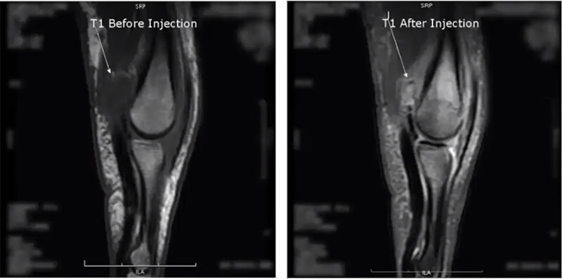 The last image is a finger in the sagittal plane. On the T1 before the injection, we see a dark area, mostly likely pathological fluid, and after the contrast injection again run as a fatsat which is usually the case with extremity images post-contrast, we now see there is pathology hidden within the fluid. This is some form of a lesion which may not have been noticed had contrast not been used.