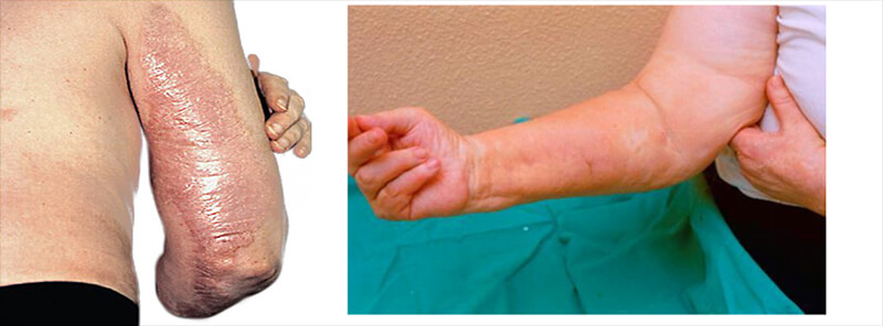 NSF or Nephrogenic Systemic Fibrosis is a condition caused by the deposition of gadolinium in the tissues of the skin because it was not removed from the bloodstream. The deposition of the gadolinium results in a fibrotic response where the tissue will thicken and become fibrous. When joints are involved, the joints will contract. The disease can be fatal because the tissue of the heart, lungs, and liver may become involved as well. While rare, it is a very important side effect to gadolinium which much be understood and appreciated.
