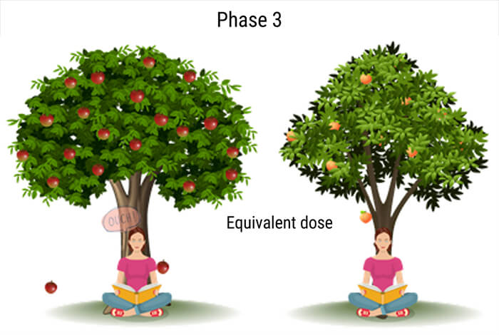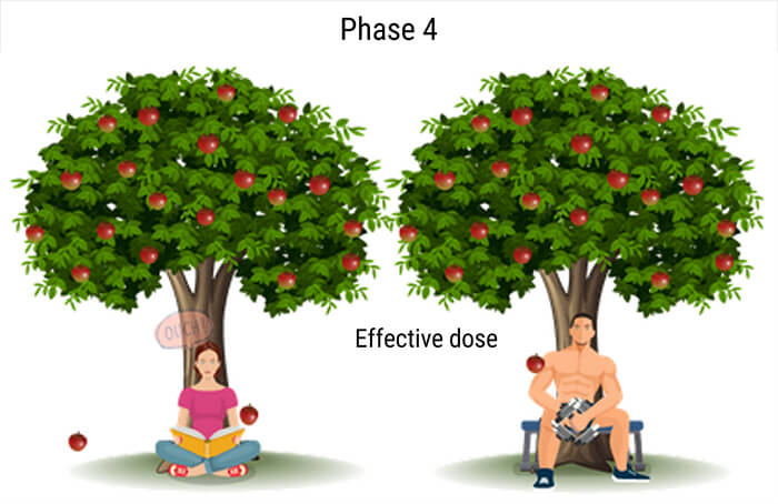 As shown in phase 4, when the same apple hits the bodybuilder’s shoulder, he does not express any reaction. Whereas the same apple caused a painful reaction for the girl. In this example, the same type of radiation caused different effects on 2 different types of irradiated tissues. This clarifies the concept of the Effective Dose that allows the comparison between 2 individuals.