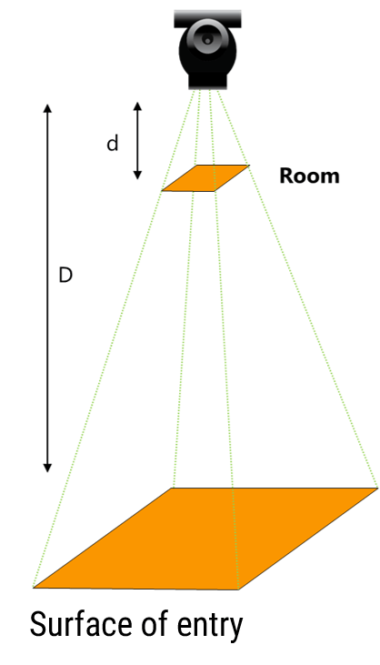 The exposure distance is not included in the calculation of the DAP since, according to Keppler’s law, the intensity of radiation decreases as a function of the square of the distance. Between the chamber and entry surface, the dose is proportional to d/D but the area increases with the distance as per D2/d2. It all cancels out.