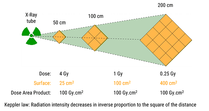 For a radiological examination, the dose-area product (DAP) is recorded. For that measurement, the system consists in a flat and sufficiently large ionization chamber to intercept the entire examination beam. The apparatus measures the product of the beam area and dose delivered which is constant irrespective of where the measurement is made. The dose-meter is usually located at the level of the collimator (diaphragm) of the installation.