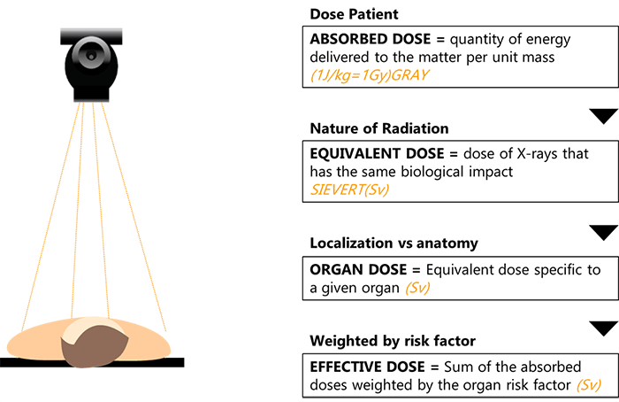 Please note that it is difficult to make a direct measurement of organ dose or effective dose in a patient, thus there is a need to a quantity that can be used to estimate them, but can be measured easily. The most useful quantities in radiography are the Entrance surface dose (ESD) and the Dose-area product (DAP).