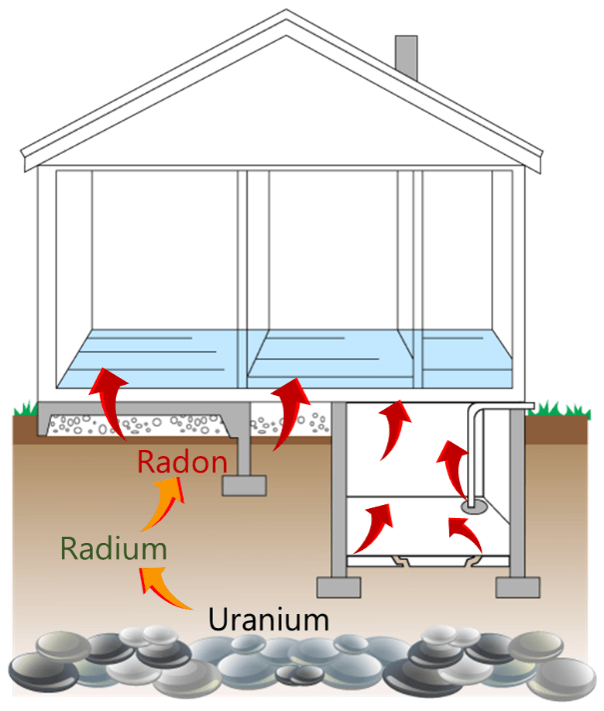 Radon is an odorless and colorless radioactive gas that is produced by the decay of uranium-238. It is an inert gas, meaning that it does not react with surrounding matter, and can move up through the ground and into the atmosphere. It is the second leading cause of lung cancer in America. For this reason, the EPA has set guidelines for maximum environmental radon levels based on limiting the risk of developing lung cancer from radon exposure. It recommends remediation at a maximum of 4 picocuries/liter (pCi/L) of radon in air.
