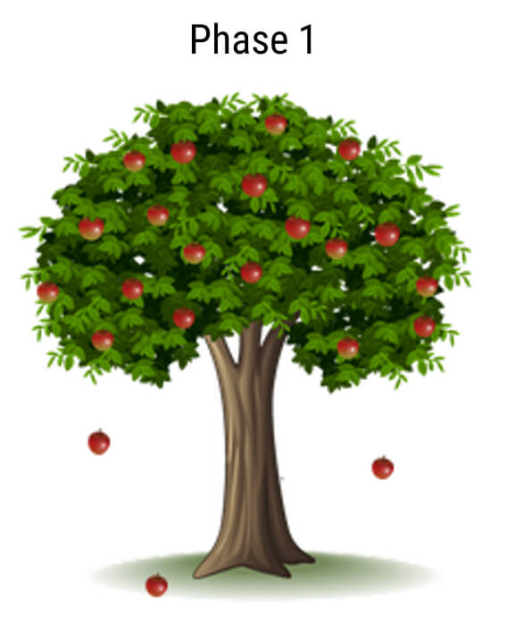 As shown in phase 1, the apple tree is considered to be a radiation source. The 3 apples falling down represent the radiation emitted by the radiation source. Now if we consider a girl sitting in the shade of the apple tree.