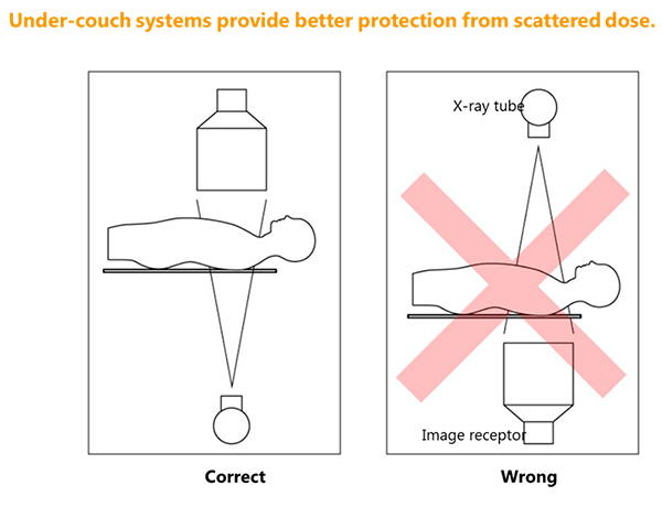 When the x-ray tube in a mobile C-arm unit is positioned under the patient and table, less radiation reaches the facial and neck region of the operator. It is recommended to keep the tube in this position when possible.