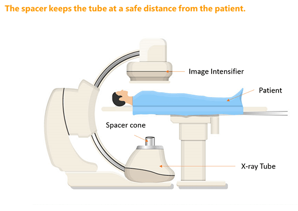 The use of the spacer is always recommended. The spacer is a safety device attached to the x-ray tube housing that keeps the patient from coming dangerously close to the x-ray source during a fluoroscopic procedure that uses a C-arm type of unit.