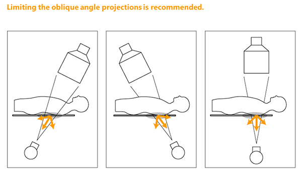 When possible, the operator should work on the image intensifier side of the table when oblique angles are applied.
