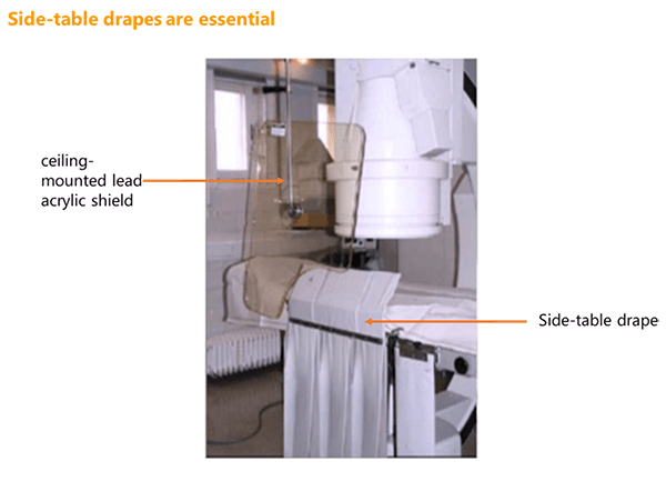 Recent advancements allow the combination of both the side-table lead drapes and the addition of a ceiling-mounted lead acrylic face and body shield. These drapes should be routinely inspected and replaced as needed. It is important that shielding does not interfere with the procedure and that the surgeon or interventional specialist is consulted prior to placement.