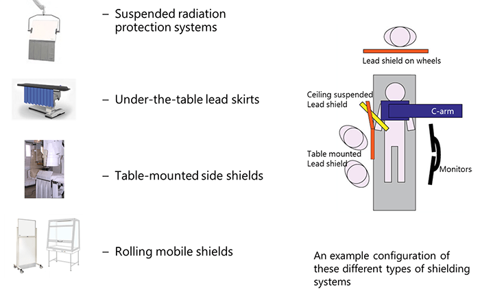 In addition to the radiation protection apparel, secondary barriers are mandatory in the OR. Secondary barriers can be equipment-mounted or mobile. Their purpose is to protect operators and other personnel from scatter radiation. They can be installed in different configurations and include: