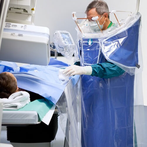 Radiation attenuating flexible gloves help minimize exposure to the operator’s hands while allowing him the dexterity to perform the procedure. Besides the gloves, a special X-ray attenuating cream provides extra protection for the operator’s hands.