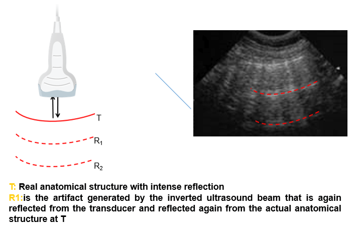 Reverberation artifact occurs when the ultrasound beam encounters two highly reflective structures. It reflects between lungs, ribs, and skin. When the ultrasound beam reflects back and forth between the highly reflective structures, the ultrasound transducer interprets the sound waves returning as waves returning from deeper depth since it took longer for the wave to return to the transducer.