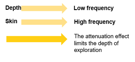 The attenuation is one of the parameters that limit the maximum frequency. It is important to note that lowering the frequency improves the depth of exploration because the ultrasound attenuation primarily increases with frequency. The maximum depth of exploration with a center frequency of 20 MHz is approximately 6-10 mm.