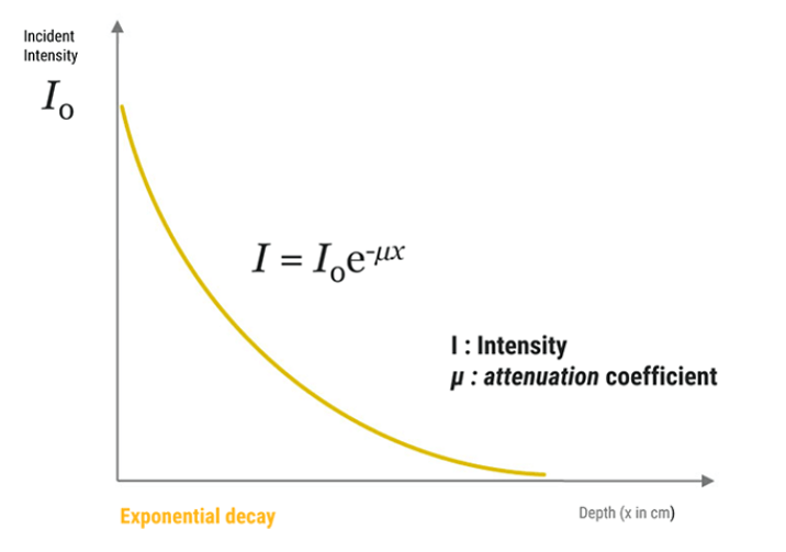 The amplitude and intensity of ultrasound waves decrease as they travel through tissues. Theoretically, the attenuation coefficient (μ) in soft tissues, is almost proportional to the ultrasound frequency and depth, with a range between 0.5 and 1 dB / (MHz.cm).