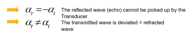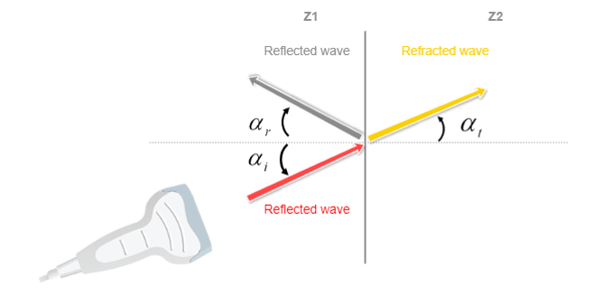Another phenomenon is the Refraction of a sound wave, which occurs when the wave travels between tissues with different propagation speeds. The refraction is defined by the change in the direction of the sound wave and is determined by Snell’s law. We can see how the direction of the wave has changed or deviated, as it passes through the interface.