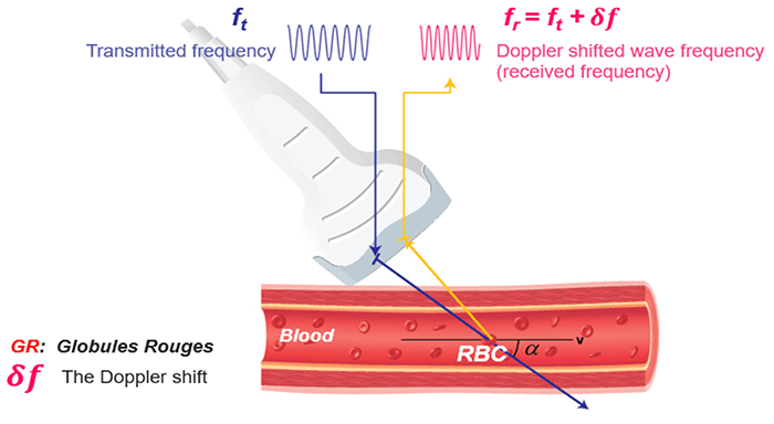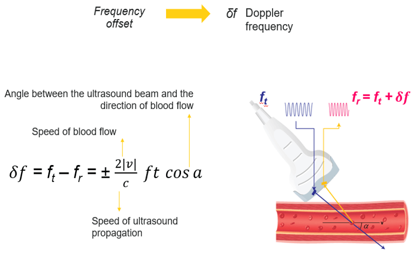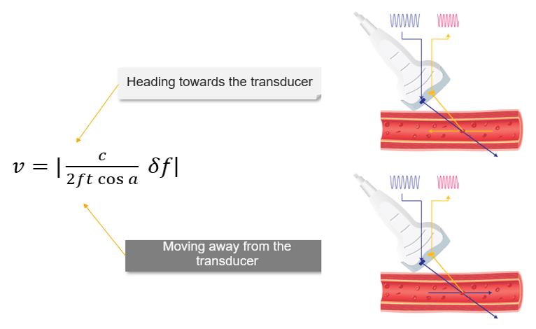 The Doppler equation shows the relationship between the transmitted Doppler shifted signal (Ft) and the blood flow velocity (V): V = c/(2ft cos a).δf, where the following represent: δf is the Doppler-shifted signal, Ft is the transmitted Doppler frequency, c is the propagation speed of ultrasound in soft tissue, V is the velocity of the moving blood, and a is the angle between the Doppler ultrasound beam and the direction of blood flow.