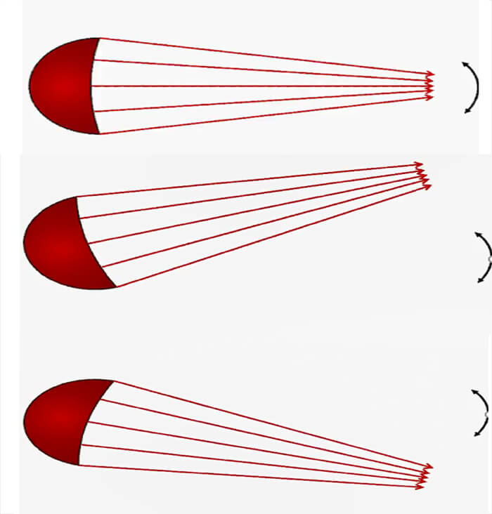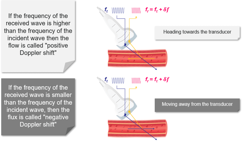 Blood flow moving towards the probe produces positive Doppler shifted signal. On the other hand, blood flow moving away from the probe produces negative Doppler-shifted signals. The image on the top illustrates the change in the received backscattered signals and the resulting Doppler shifts for blood moving towards the transducer. In this image, the relative direction of the blood flow with respect to the Doppler beam is towards the transducer, blood flow moving towards the transducer produces received signals (Fr) which have a higher frequency than the transmitted beam (Ft).