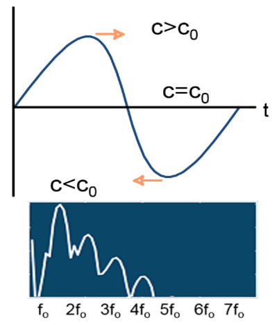 As we mentioned previously, the transmitted pulse consists of a range of frequencies centered around f0. In a linear medium, the echo pulse frequency is the same as the fundamental frequency but has lower energy, whereas the nonlinear medium results in harmonic waves of higher frequency and lower energy as shown in this figure. It is important to note that the majority of clinical US systems use second harmonic (ie, 2f0) echoes for THI image formation.