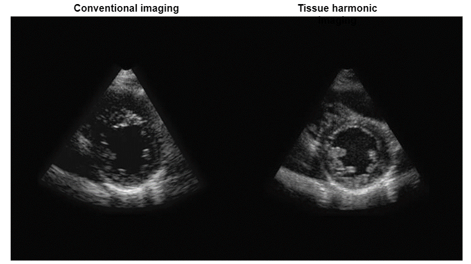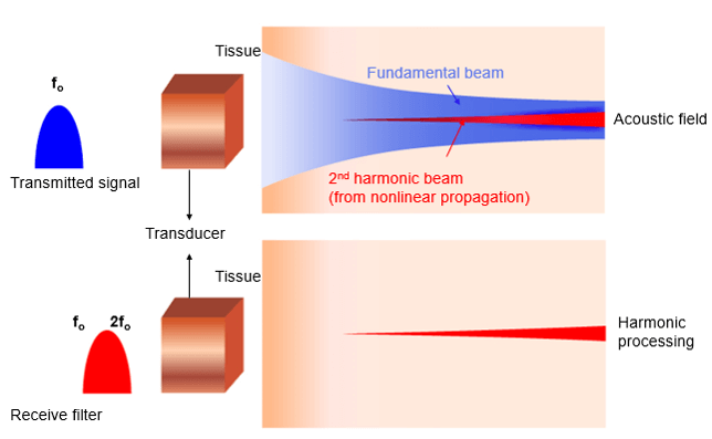 The advantages of harmonic imaging include, but are not limited to improved signal-to-noise ratio and reduced artifacts, or better axial and lateral resolutions due to higher frequencies and narrower beams.