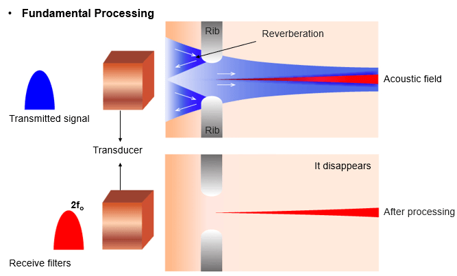 As they are of low energy (mostly equal to f0), they never develop harmonics. Therefore, receiver filters tuned at harmonic frequency remove reverberations at f0 and clean up the image.