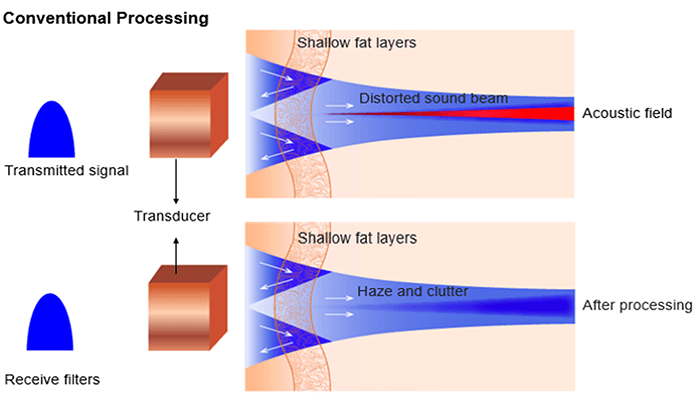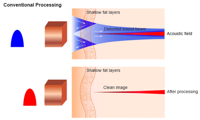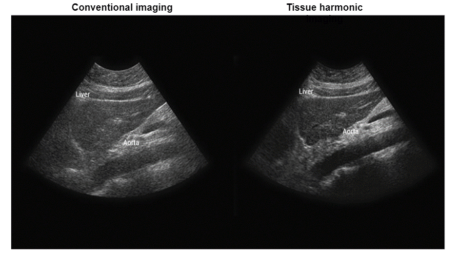 Harmonic imaging is also used for aberration corrections. Aberration phenomenon occurs when the ultrasonic waves are distorted due to local changes in the speed of sound. Shallow fat and skin layers distort sound beam. It is important to know that distortions are of low energy but send sound in random directions.