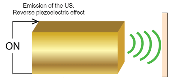 The reverse effect is defined as the generation of a mechanical wave resulting from the application of an electric field. When an electric field is applied, the charge carriers are shifted in the piezoelectric materials, leading to a macroscopic change in the length of the material (inverse piezoelectric effect), thus to the emission of the ultrasound wave. The resulting sound waves propagate in the surrounding medium, where their speed varies according to the density and the elastic properties of the medium.