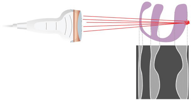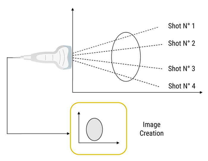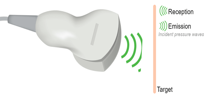 An ultrasound probe emits a pulse in response to electrical excitation. This ultrasonic pulse, transmitted to biological tissues, spreads by degrees.