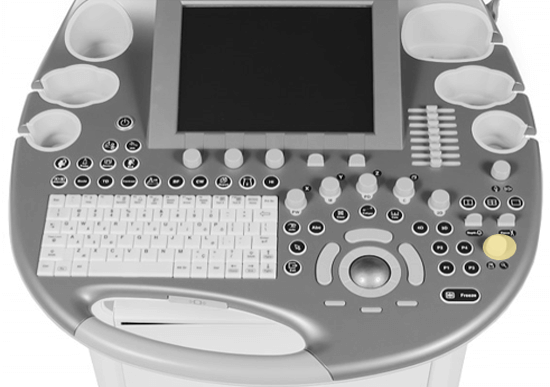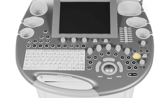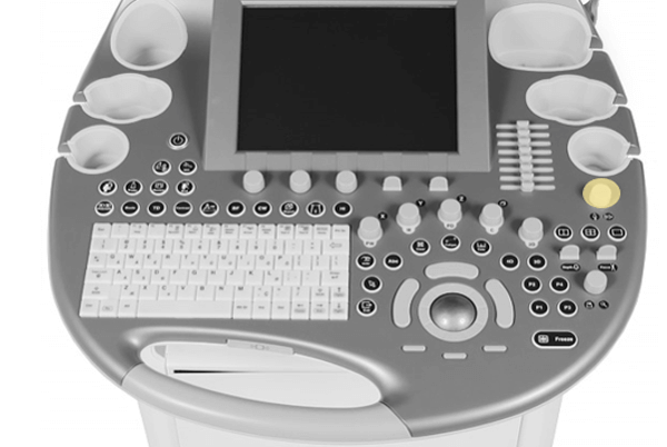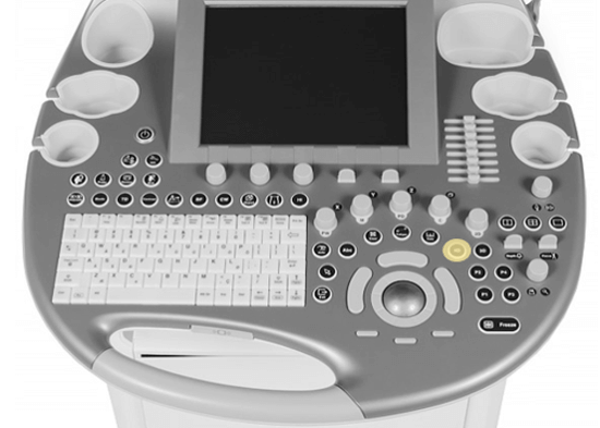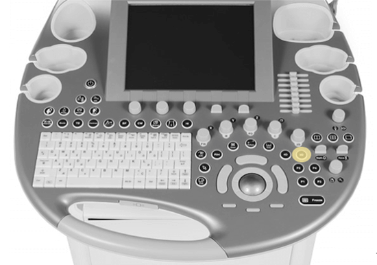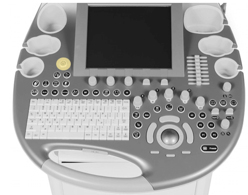 The trackball is used to move the cursor on the image or to navigate through the menus. It is used to move objects on the monitor (same as using the mouse on the computer), measure, annotate and move the Doppler boxes to the desired location. It has kidney buttons either side which is used to select functions (the same as clicking buttons on a mouse for the PC).
