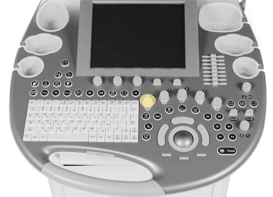The ‘Freeze’ button is the large blue button in the direct center of the control panel, labeled with a snowflake. Freeze function stops imaging and freezes the image. While the image is frozen, the sonographer takes the measurements and adds the organ annotations on the image before saving it.