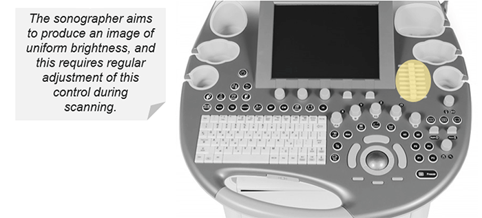 Since the ultrasonic waves are attenuated or absorbed, as they pass through the tissues, the reflected waves of the farthest areas are weaker than the waves reflected from the areas near the transducer. Without TGC, the image would have a gradual brightness ranging from light to dark (from the near field to the far-field).