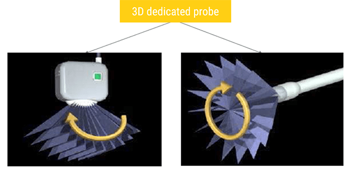 As explained previously, 3D ultrasound is a series of data that contains a large number of 2D planes (B-mode images). Once the volume is acquired using a dedicated 3D probe, you can navigate through the different 2D planes that make up the total volume. Once you have all the data, you can also see the different planes by rotating the volume.