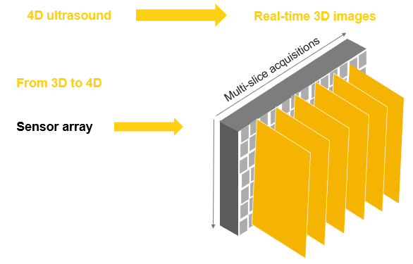 4-dimensional ultrasound imaging is based on acquiring and displaying a series of 3D data with their reconstructions and multi-planar renderings in real-time while scanning the patient. 4D scans show moving 3D images of your baby for example.