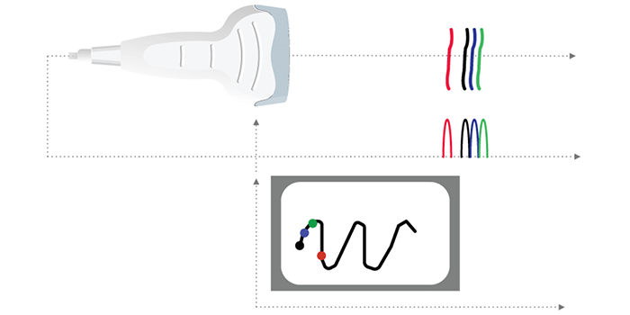 However, It is sufficient to perform a large number of different ultrasound shots by shifting the firing axis each time. The position of a point on the screen depends on the flight time of the echo and the position of the corresponding ultrasonic firing axis.